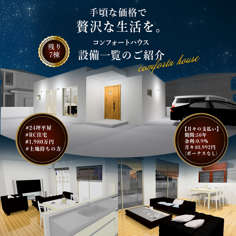 【コンフォートハウス】は、RC平屋住宅80㎡(24坪)が、通常2,400万円(税込)のところ1,980万円(税込)でご案内できる魅力的な新プランです。
