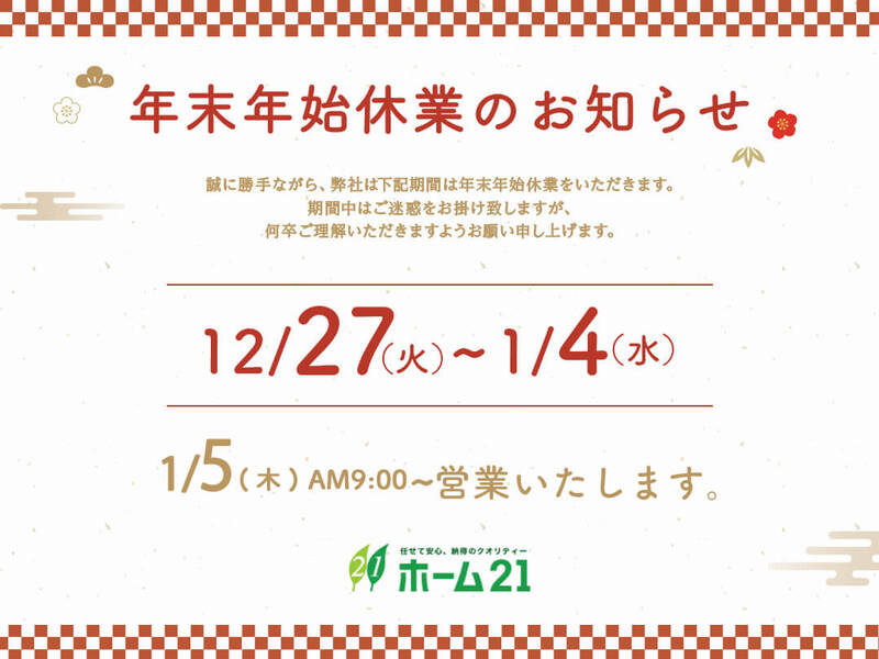 年末年始休業期間:12月27日(火)~1月4日(水)