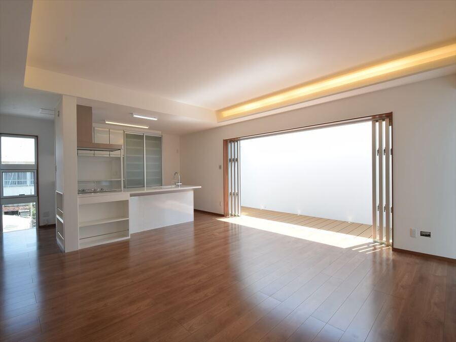 大開口のリビング掃き出し窓からコートハウスにつながる家