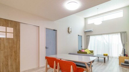 ハイサイドライトから差し込む優しい陽の光が心地よいリビングダイニング