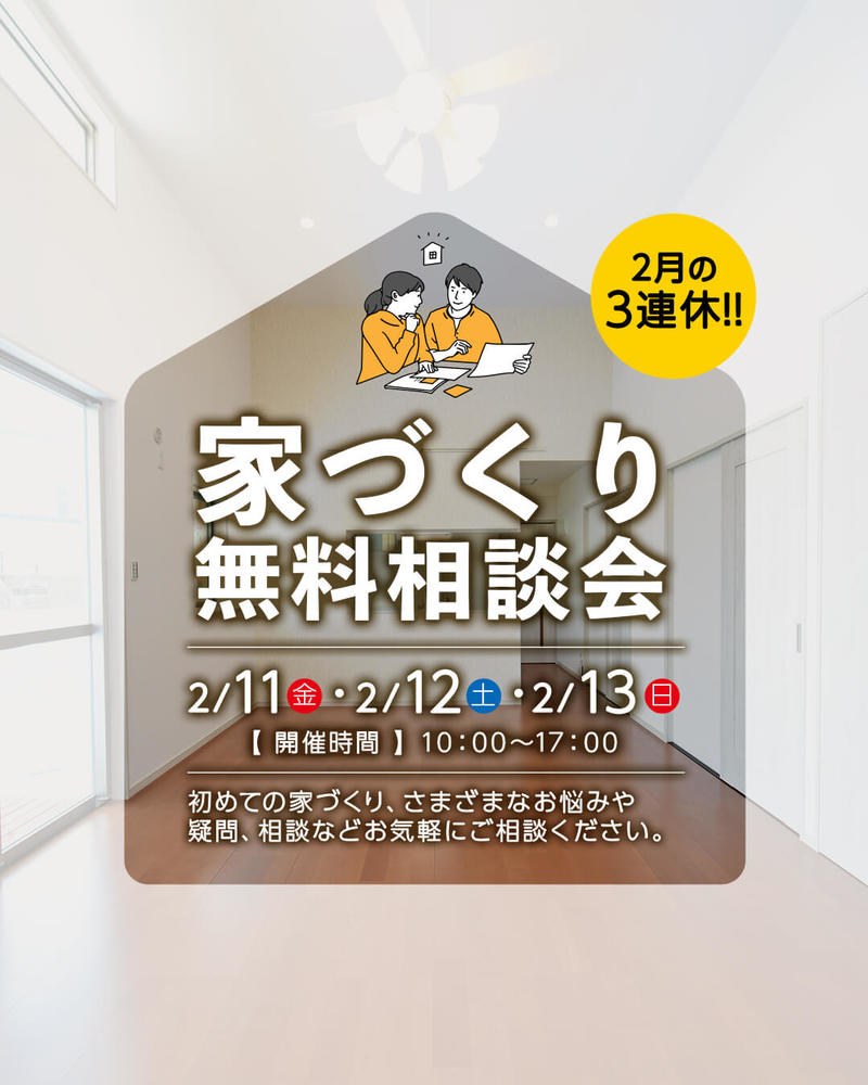 【2/11(金・祝)・2/12(土)・2/13(日)】家づくり無料相談会開催♪