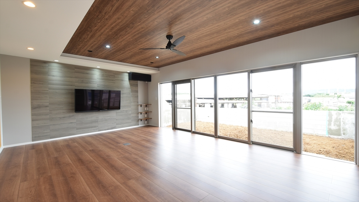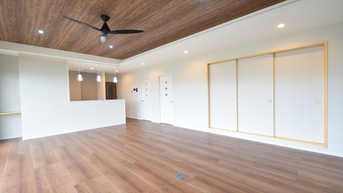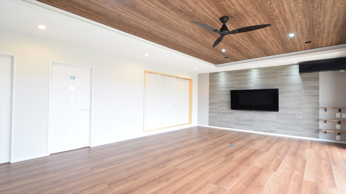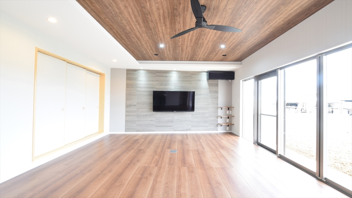 リビングの間接照明 壁掛けテレビに音響設備 床付けコンセントなど 電気設備をとことん追求し 素敵で快適な住まいが想像できます 和室の一角にはリモートで仕事が出来るよう 書斎を設けました