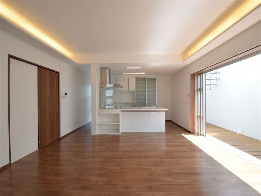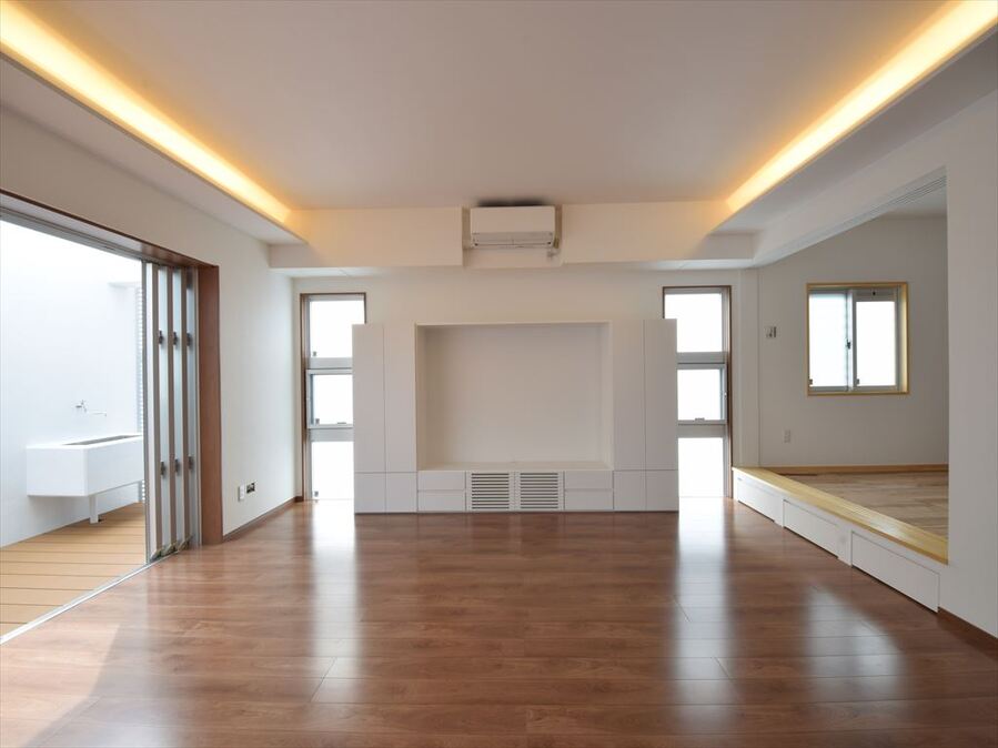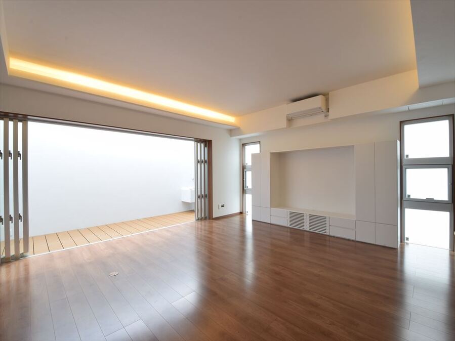 大開口のリビング掃き出し窓からコートハウスにつながる家